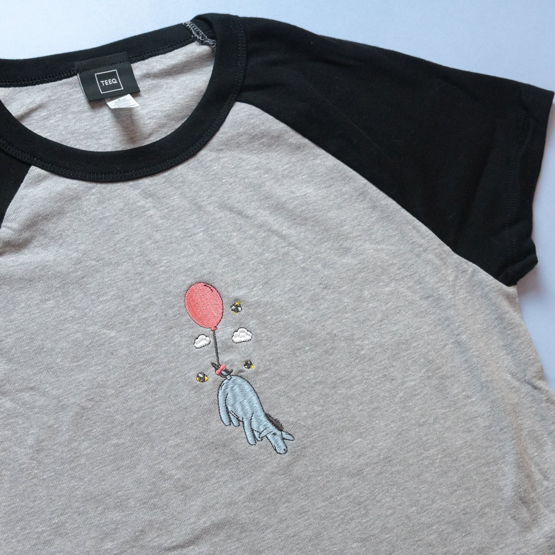 This tee features our Eeyore Balloon Embroidered Women's Ringer design — lightweight, easy to wear, and full of fun.