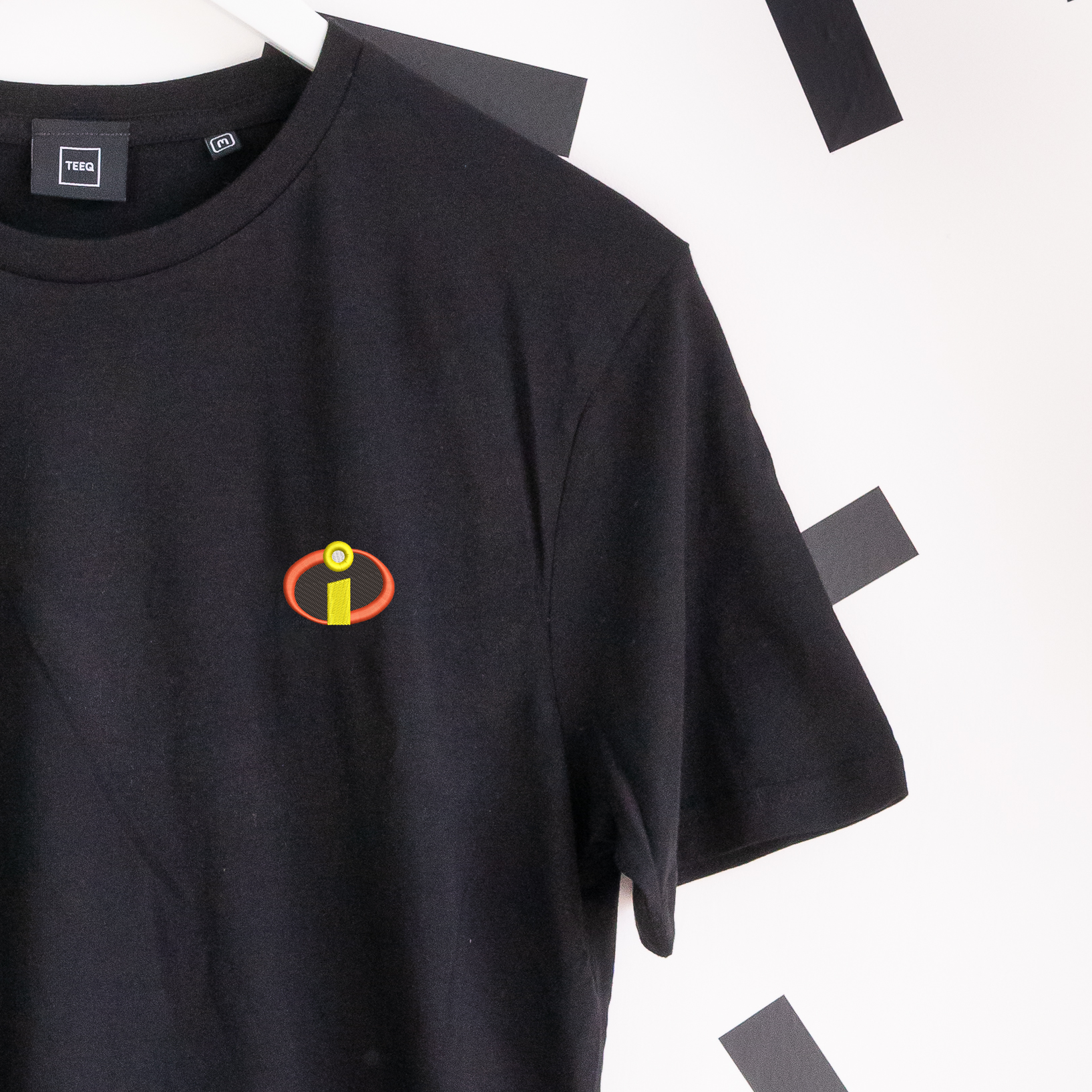Black cotton t-shirt featuring hand-embroidered The Incredibles artwork. Comfortable everyday wear in sizes S to 5XL. A must-have for superhero enthusiasts.
